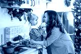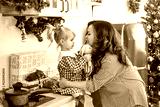 A cute little girl in a plaid dress with a young mother at home in the kitchen decorated for Christmas and New Year. Red-checked clothes.
