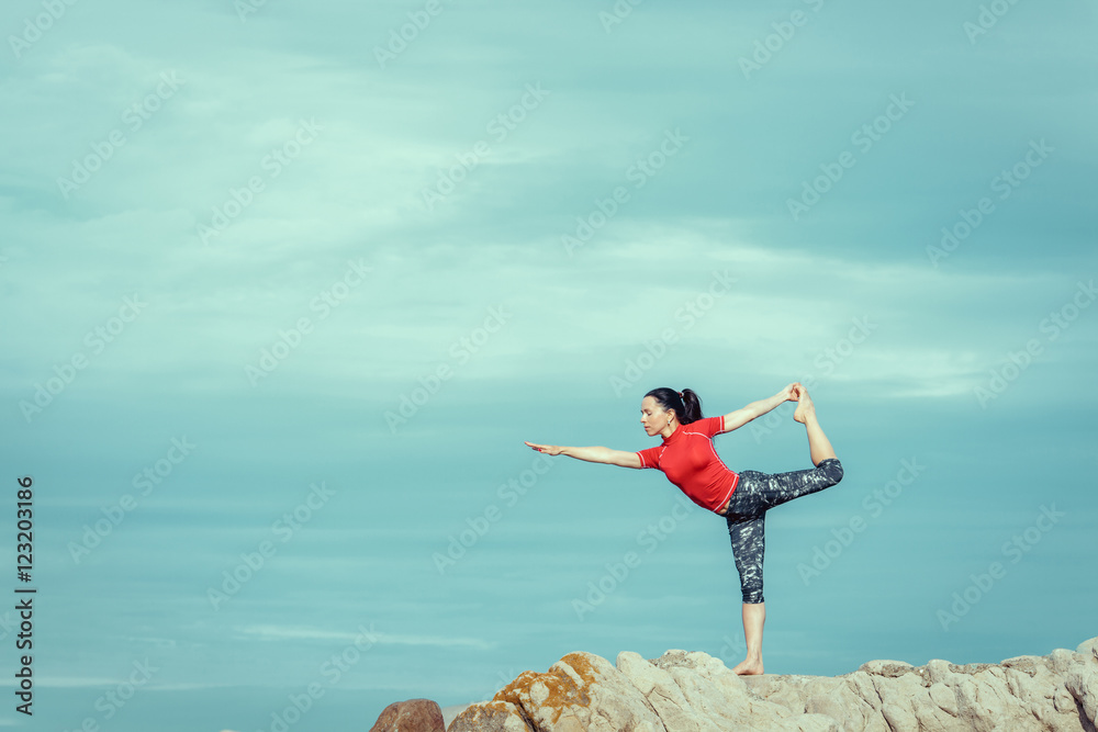 Caucasian woman practicing yoga at seashore