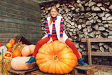 Adorable little girl of 8-9 year old choosing halloween pumpkin on farm market