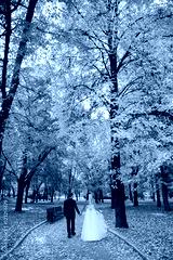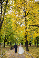 Beautiful just married couple under umbrella walking away on road at park. the bride and groom