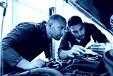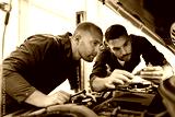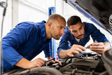 mechanic men with wrench repairing car at workshop