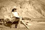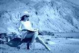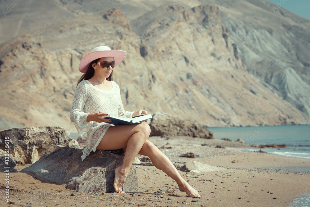 Portrait of a beautiful carefree woman walking on beach with sun