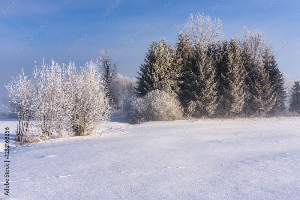 Beautiful landscape of the frozen meadow with trees in Podhale at winter. Poland