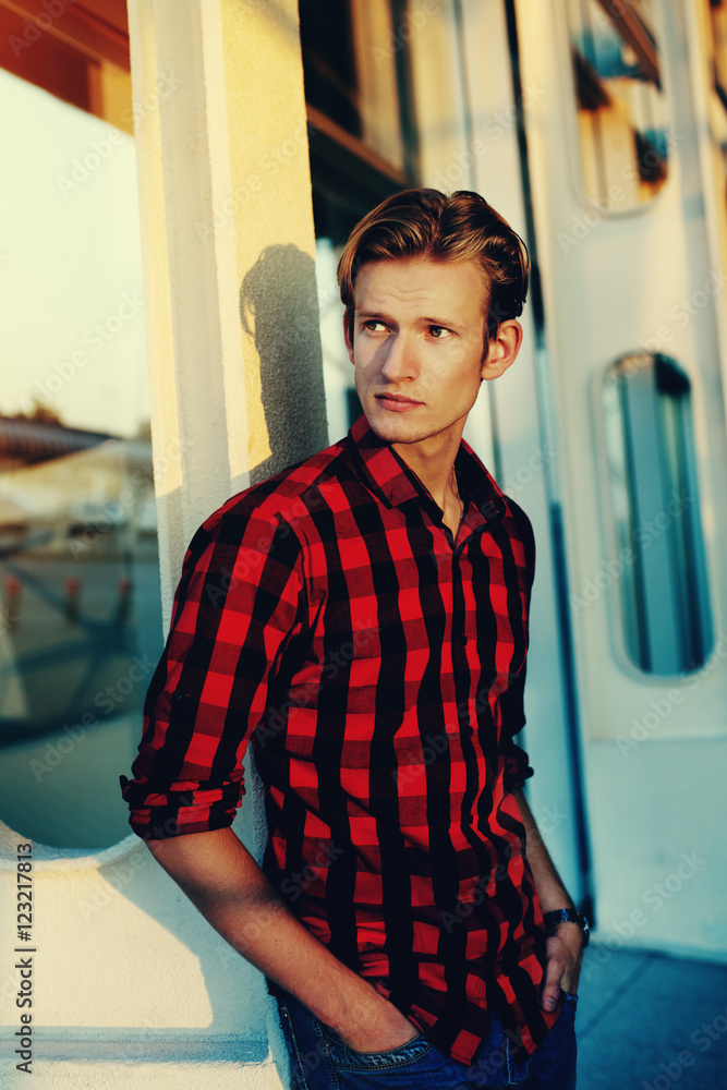 Indoor portrait of a young handsome fashionable man posing in the airport building. Looking aside. Model wearing stylish red tartan shirt. City lifestyle. Sunny day. Waist up. Toned