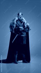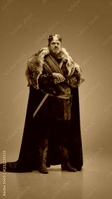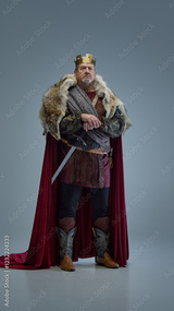 Full-length portrait of elderly man, medieval king in fur-lined cloak and golden crown, standing with hands on swords. Authority and power. Concept of history, royalty, power, fantasy