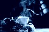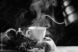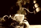 Pour black coffee into a coffee cup There are roasted coffee beans on the table. with a black background and dark colors