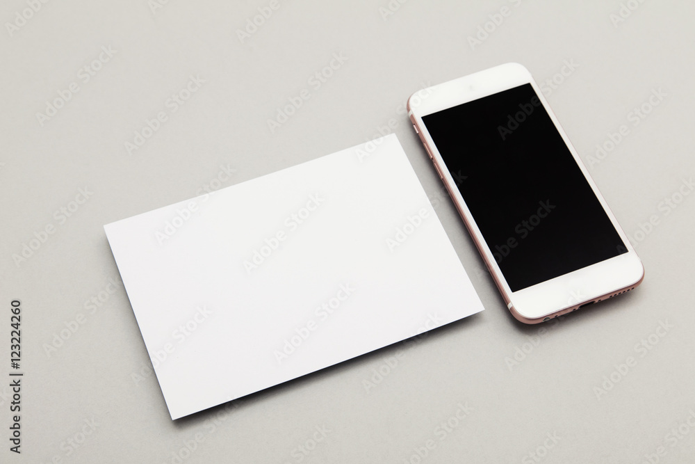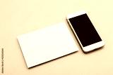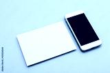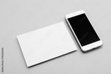 Blank white postcard flyer alongside a smartphone with a blank screen