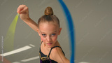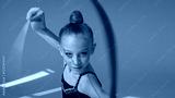 Little girl child kid daughter Caucasian schoolgirl young athlete teenager sport gymnast artistic female ballet dancer sportswoman perform swirling spinning gymnastic tape dance studio choreography