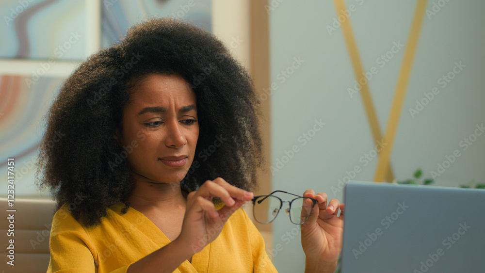 African American businesswoman ethnic business woman work on laptop in office displeased girl confused with blurry vision female manager taking off eyeglasses optical glasses eyesight focusing problem