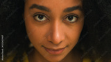 Close up face African American ethnic business woman businesswoman student eyesight stare dark eyes female teenager girl gaze looking at camera skincare health medical consultation headshot portrait