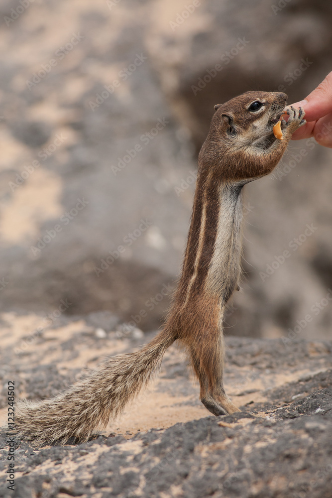 Barbary ground squirrel eating from the hand (atlantoxerus getulus), Fuerteventura, Canary Islands