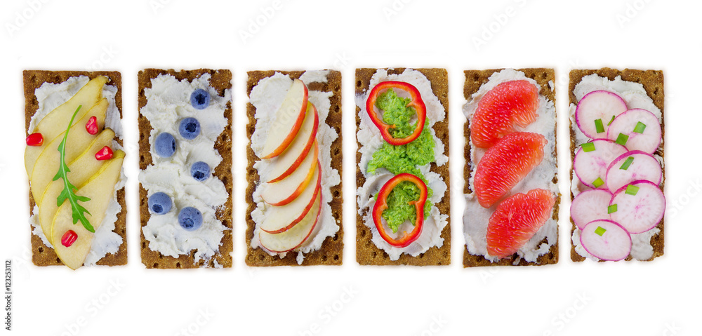 Sandwiches with cream cheese and fresh berries, fruits and vegetables. Fresh healthy appetizer snack with crispbread.