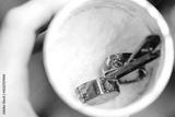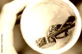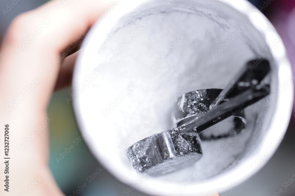 A person holding a cup with a spoon inside, perfect for use in food or lifestyle settings.