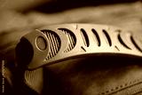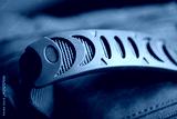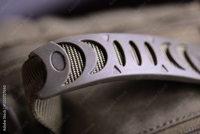 A close-up shot of a metal object attached to a backpack, suitable for use in outdoor or travel-themed contexts.