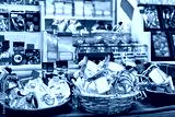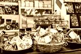 Chocolate sweets on shelves and baskets at Riga Christmas market