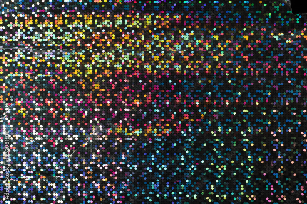 detail macro photo of silver rainbow holographic dot foil material, colorful hologram surface, glitter pixel pattern background.