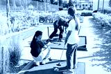 Cute school girl playing mini golf with family. Happy toddler child having fun with outdoor activity. Summer sport for children and adults, outdoors. Family vacations or resort.