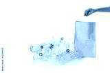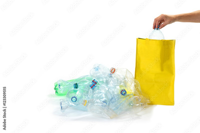Pile of plastic bottles is lying on the white background. Woman's hand is inserting plastic bottle into an empty yellow bag. All potential trademarks are removed.