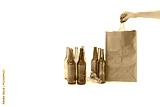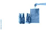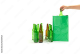 Used glass bottles are standing on the white background. Woman's hand is inserting glass bottle into an empty green bag. All potential trademarks are removed.