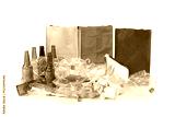 Pile of paper waste, used plastic and glass bottles are on the white background. Empty yellow, green and blue bags are standing behind them.