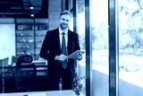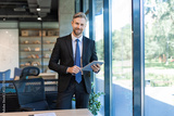 Portrait of smiling middle aged businessman standing with digital tablet at corporate office.