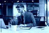 Portrait of young man sitting at his desk in the office.
