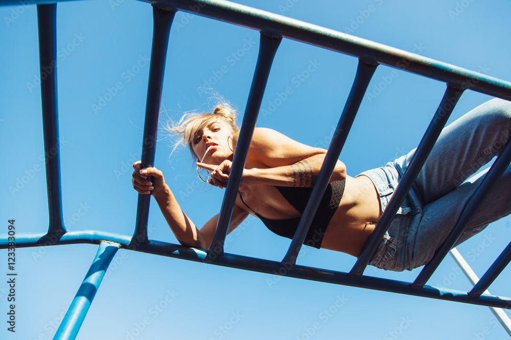 Sporty fit girl working out at outdoor gym