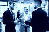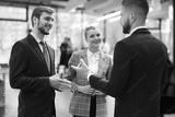 Three young businessmen standing discussing business at an office meeting.