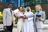 Group of multiethnic business people meeting an emirati businessman - International corporate business team bonding outdoors in the city