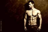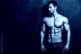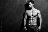 Portrait of strong healthy handsome Athletic Man Fitness Model posing near dark gray wall