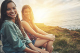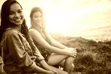 Travel, sunset and portrait with friends at beach for explore, bonding and summer vacation. Happy, calm and peace with women and ocean for holiday destination, adventure and lens flare view together