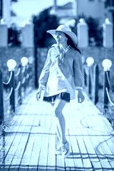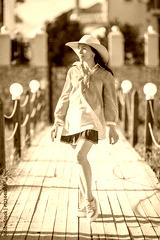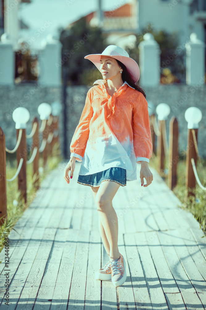 Portrait of pretty woman wearing white dress and straw hat in su
