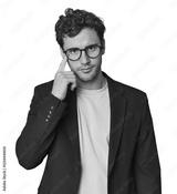 Young Hispanic businessman pointing temple with finger, thinking, focused on a task.