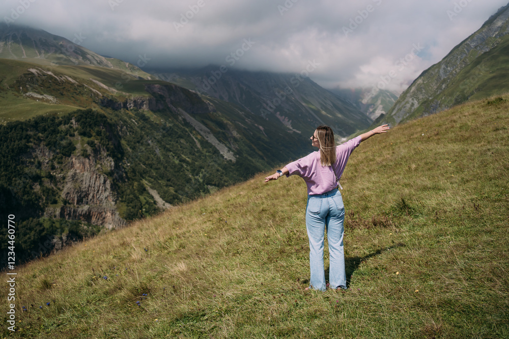 Young woman with open arms enjoying the mountain view. Summer landscape on the Georgian Military Road. Green slopes, deep gorge, and cloudy sky. Freedom and nature concept