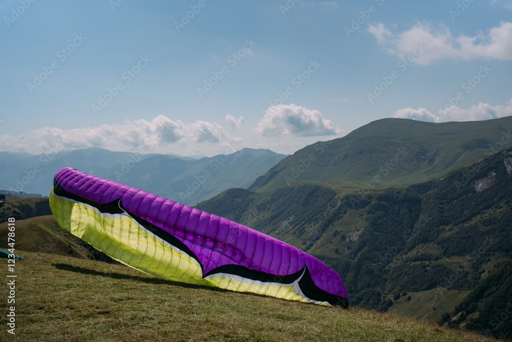 A purple-colored paraglider against the background of the mountain peaks of the North Caucasus in Georgia. The parachute is folded after the flight