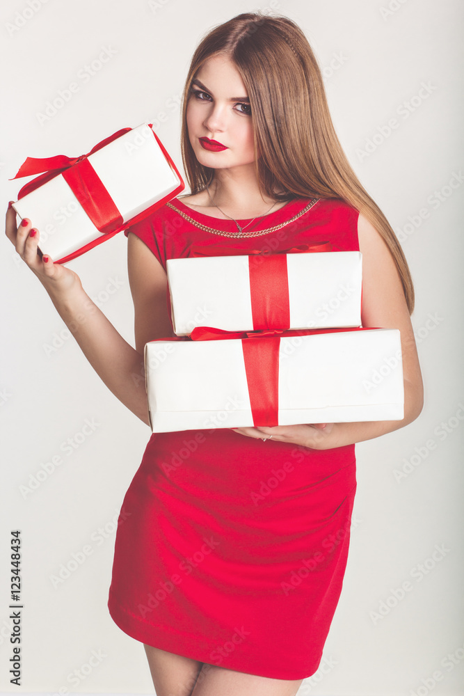 Pretty girl holding white christmas gift boxes