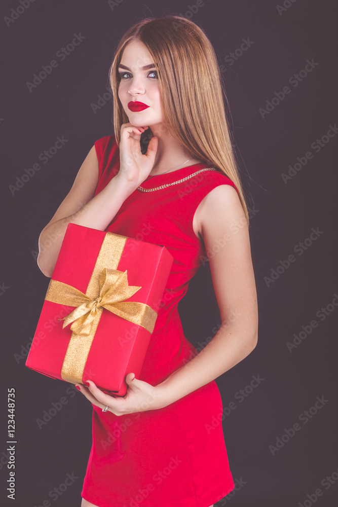 Beautiful girl holding christmas red gift box