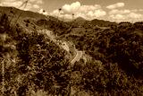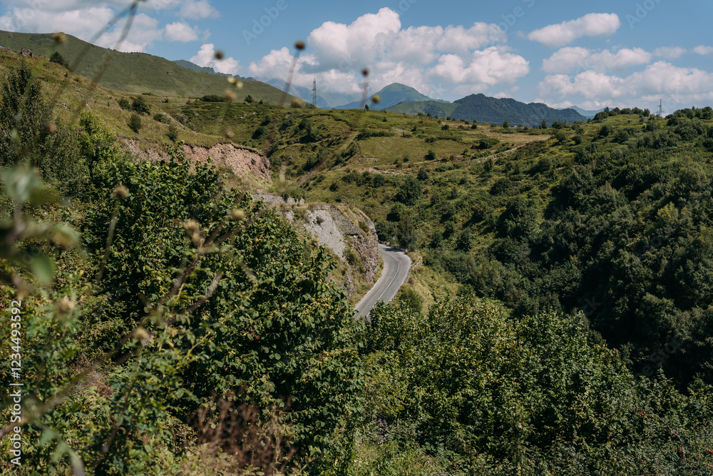 Scenic mountain valley along the Georgian Military Road. Green hills. Summer landscape in the Caucasus Mountains