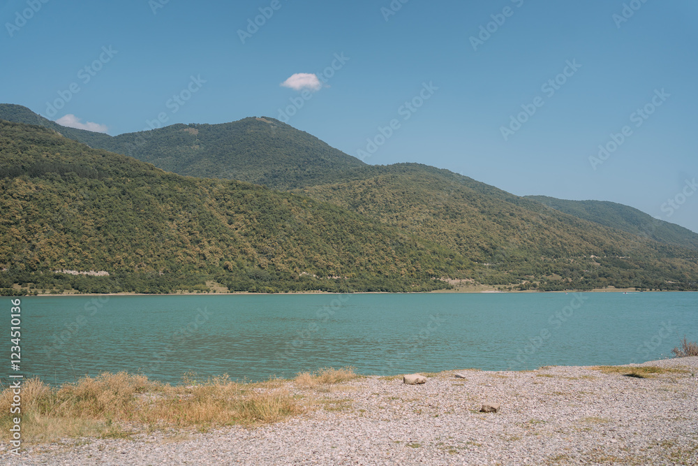 Turquoise reservoir with white sand against the backdrop of the mountains of the North Caucasus. Blue Lake