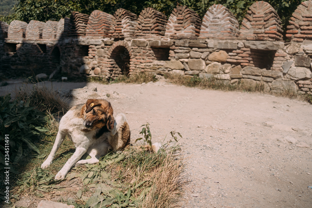 A dog resting near an ancient fortress. A stray dog lying on the ground in the shade of old stone walls. Historic architecture and nature