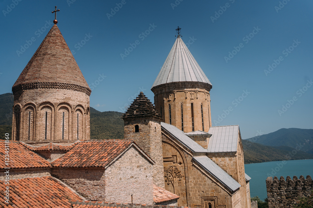 Ananuri Fortress and Zhinvali Reservoir in Georgia. Ancient stone fortress with conical towers and tiled roofs overlooking a blue mountain lake. Green hills in the background. Historic landmark and sc