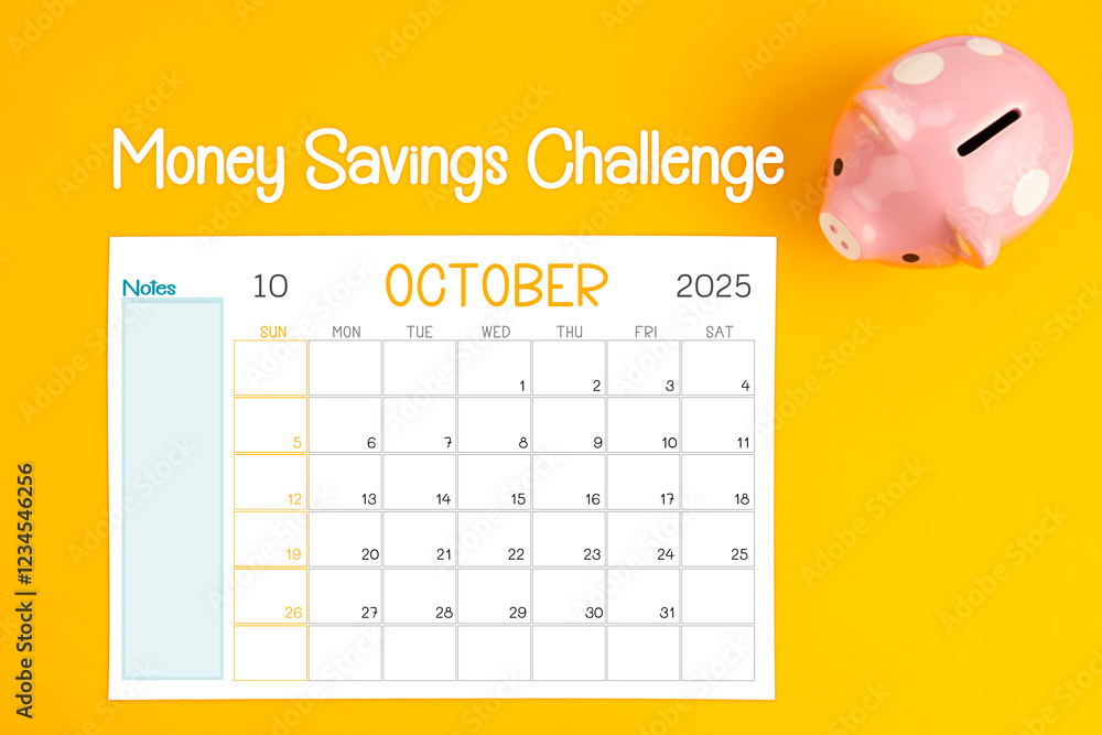 October 2025 calendar and piggy bank. Money savings challenge concepts.