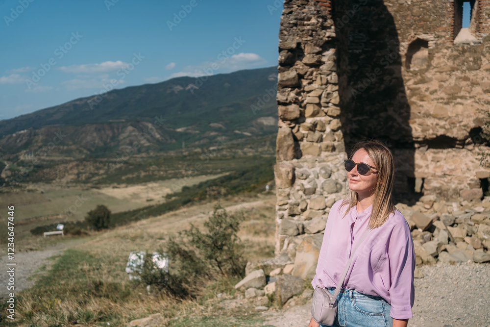 A tourist girl in a lilac blouse, blue jeans, and sunglasses against the background of ancient ruins. The place of power is Jvari in Georgia
