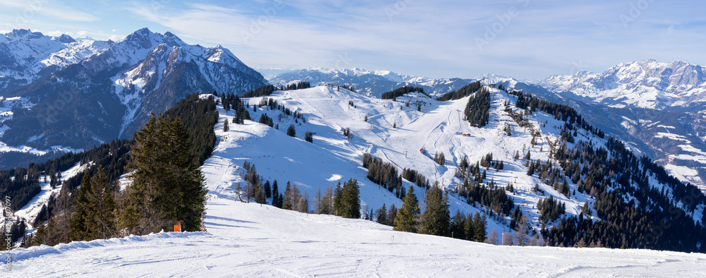 Panorama view of ski slopes at Flachau and St. Johann in Austrian Alps, Snow Space Salzburg, part of Ski Amade skiing area