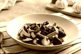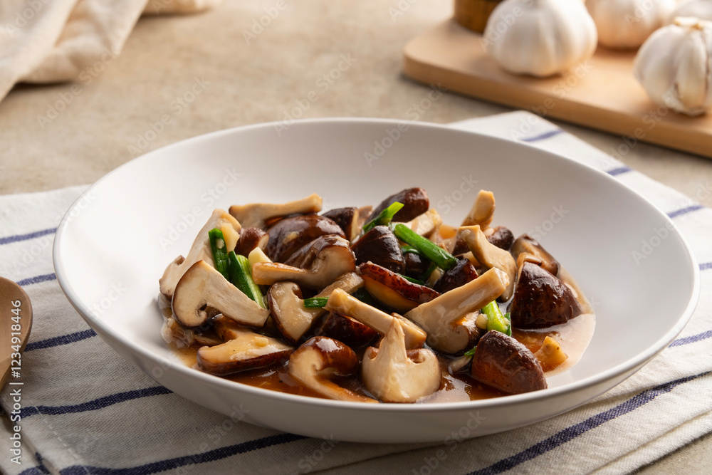 Stir Fried Fresh Shiitake Mushrooms with Vegetarian Mushroom Sauce in white plate.vegan asian food style.