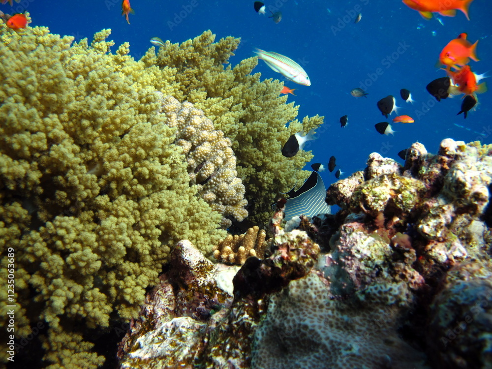 Colorful tropical fish on a coral reef, amazingly beautiful fairy world. In the coral gardens of the Red Sea.