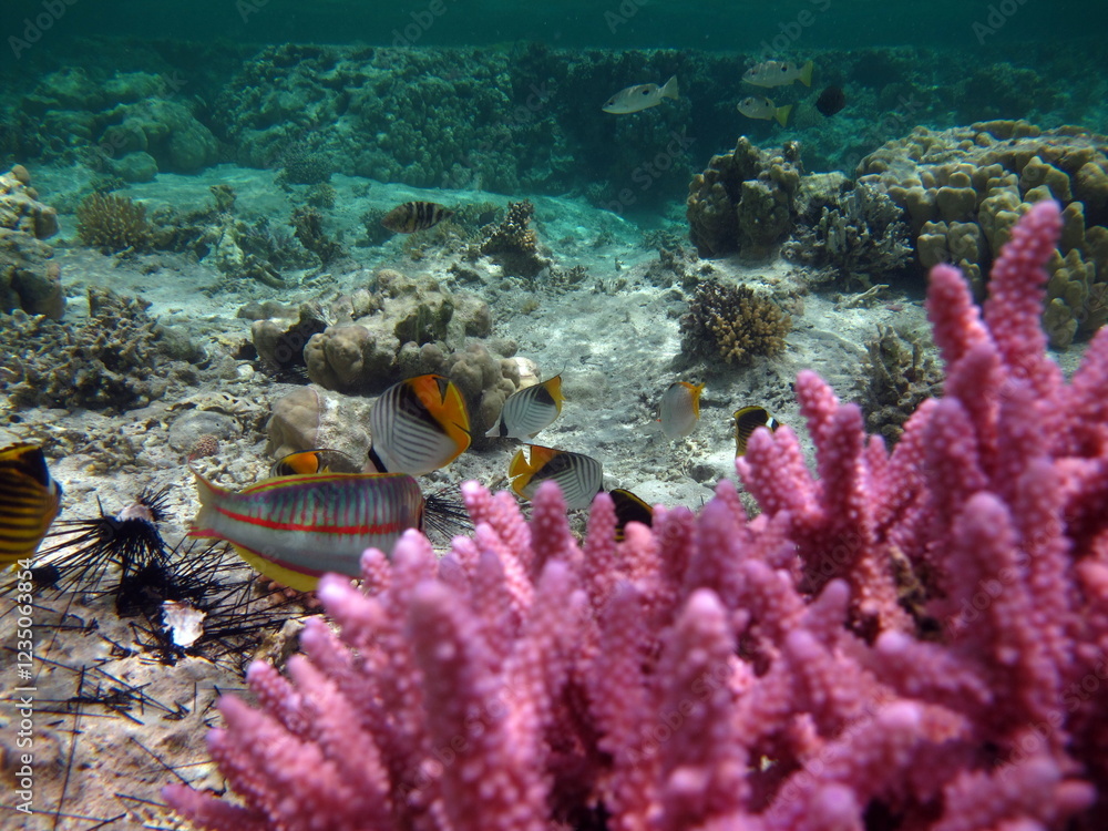 Colorful tropical fish on a coral reef, amazingly beautiful fairy world. In the coral gardens of the Red Sea.