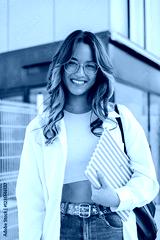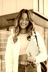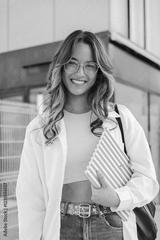 Smiling Young Student Holding Notebook While Walking Confidently Through Campus In Bright Daylight With Long Flowing Hair And Stylish Glasses Radiating Joy And Excitement For The New Academic Year