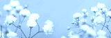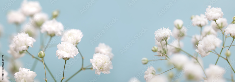 Smoke Soft focus blur white gypsophila flower bouquet on blur blue gray horizontal long background.