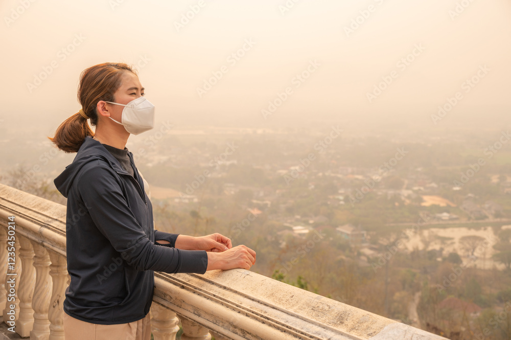 Asian woman while looking to Chiang Rai town covered with bad air pollution.
